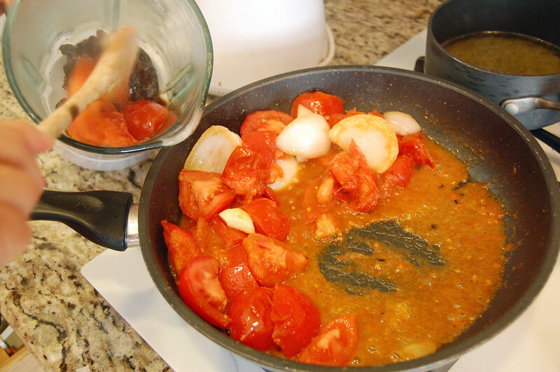 Hiérvelos junto con los jitomates, la cebolla y el ajo durante unos 6–10 minutos, hasta que todo esté cocinado.